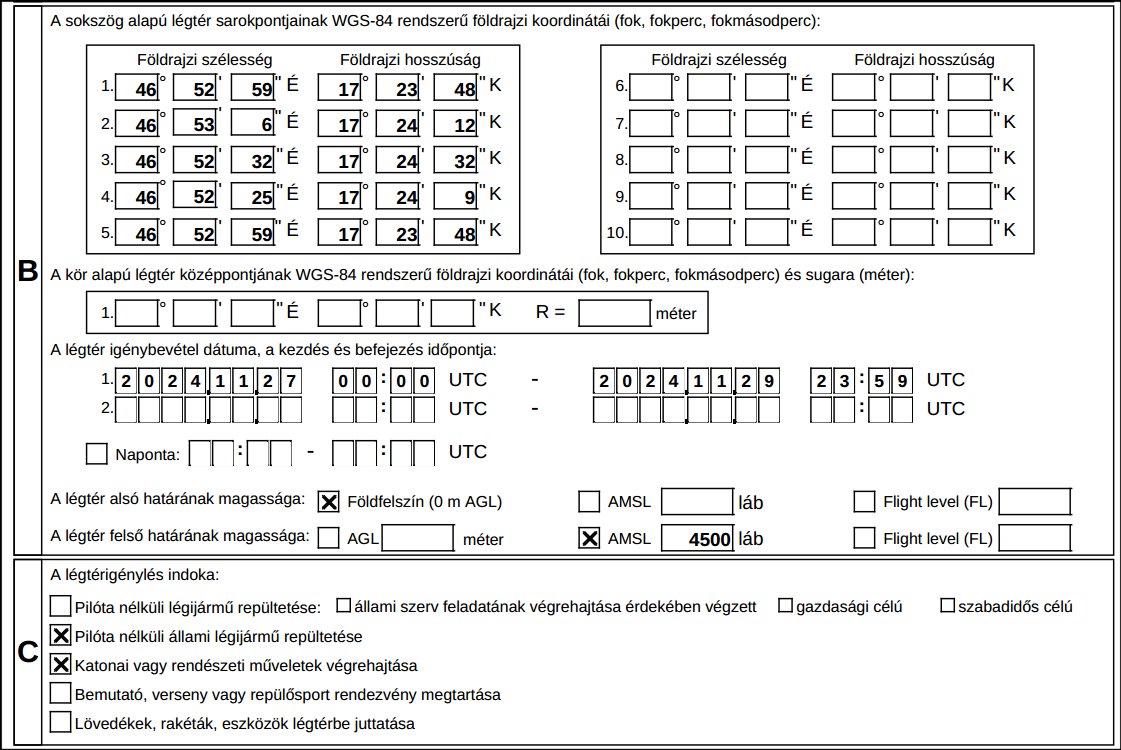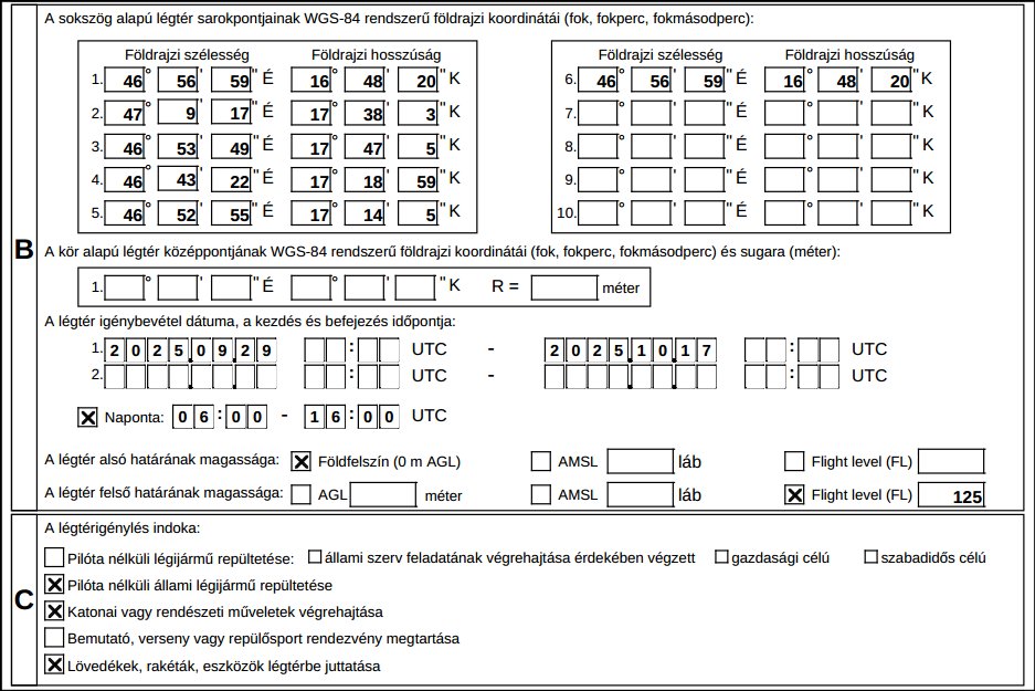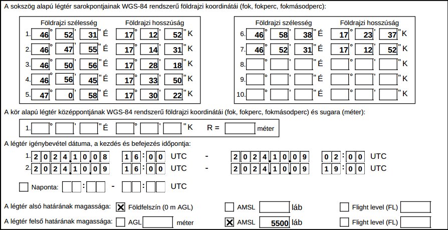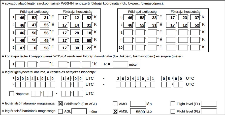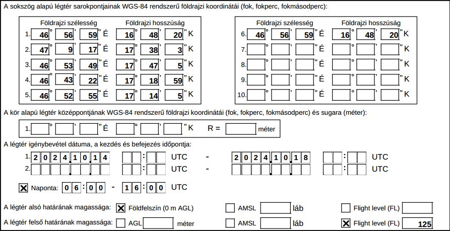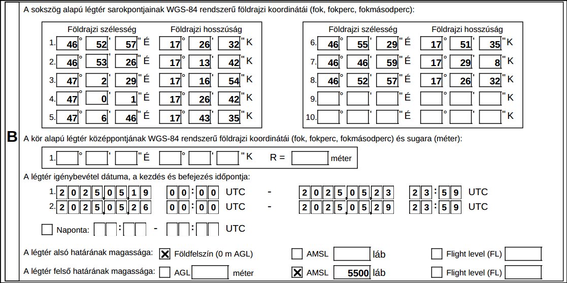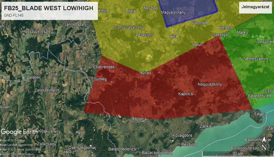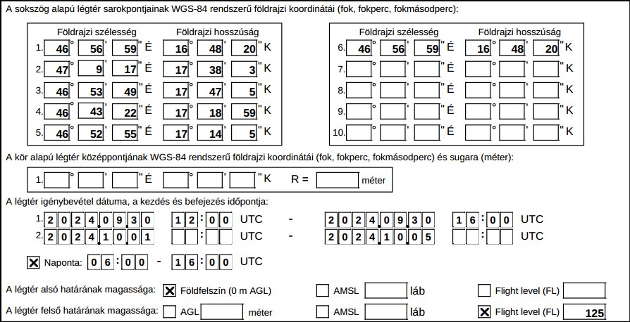 Eseti légtér 2025.09.29-10.04., 10.06-11., 10.13-17. között naponta: 0600Z – 1600Z Magasság: GND- FL125